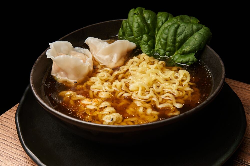 Говяжий бульон, лапша чан-рамен, шпинат , вонтоны с лососем и треской ,японский омлет