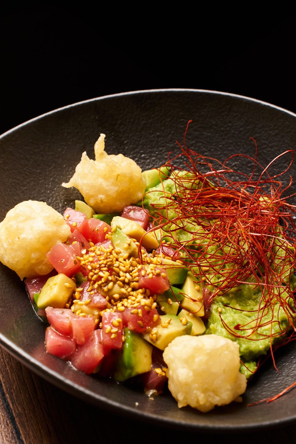 Тунец охлажденный, гуакамоле , хрустящие рисовые шарики, соус Васаби Дрессинг