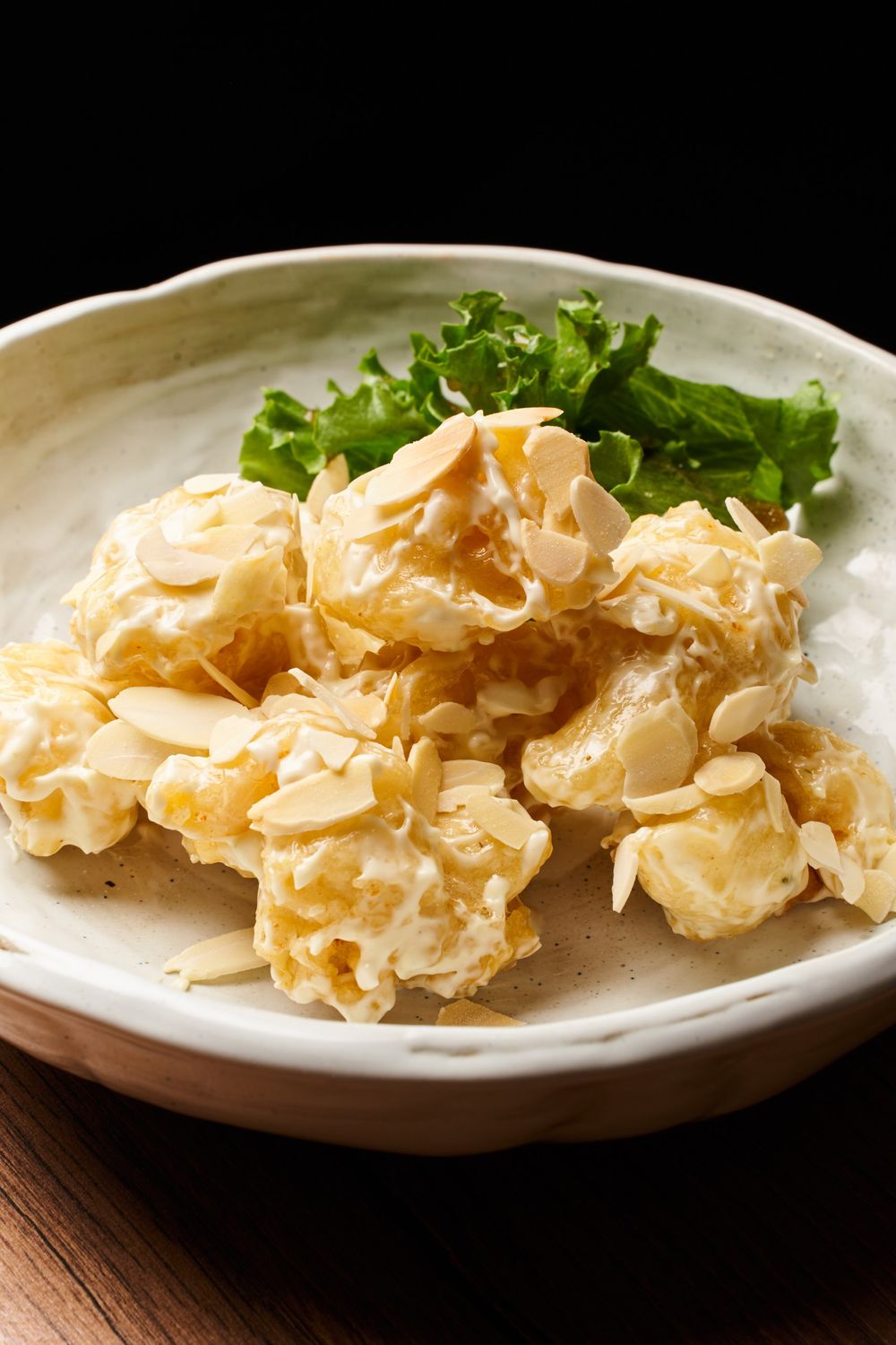 Королевские креветки в кляре во фритюре, лепестки миндала, соус ВАсаби