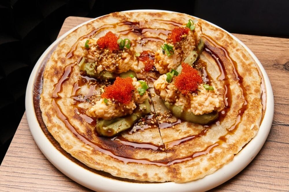 Лепешка из слоеного теста, гуакамоле, креветка, тобико, соус спайси