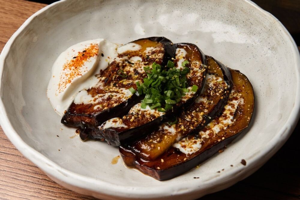 Обжаренные слайсы баклажана, соус барбекю, кефир-васаби. греческий йогурт, зеленый лук, приправа фурикаке