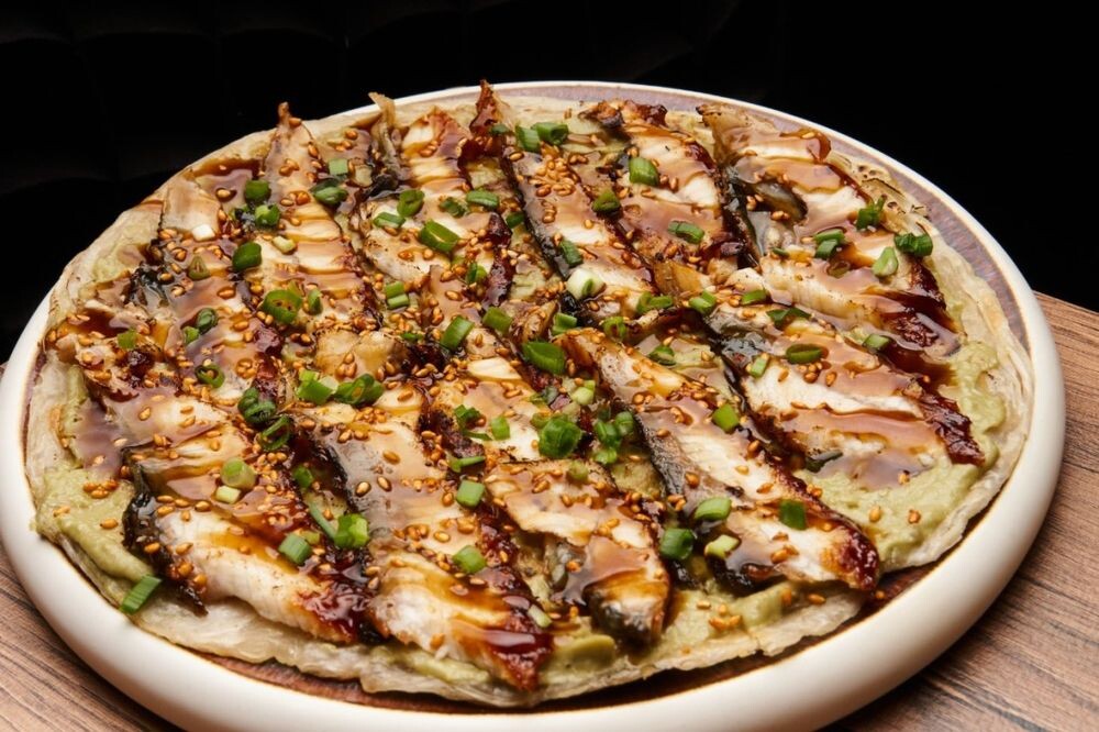 Лепешка из слоеного теста, соус гуакамоле, угорь копченый, соус Тонкацу